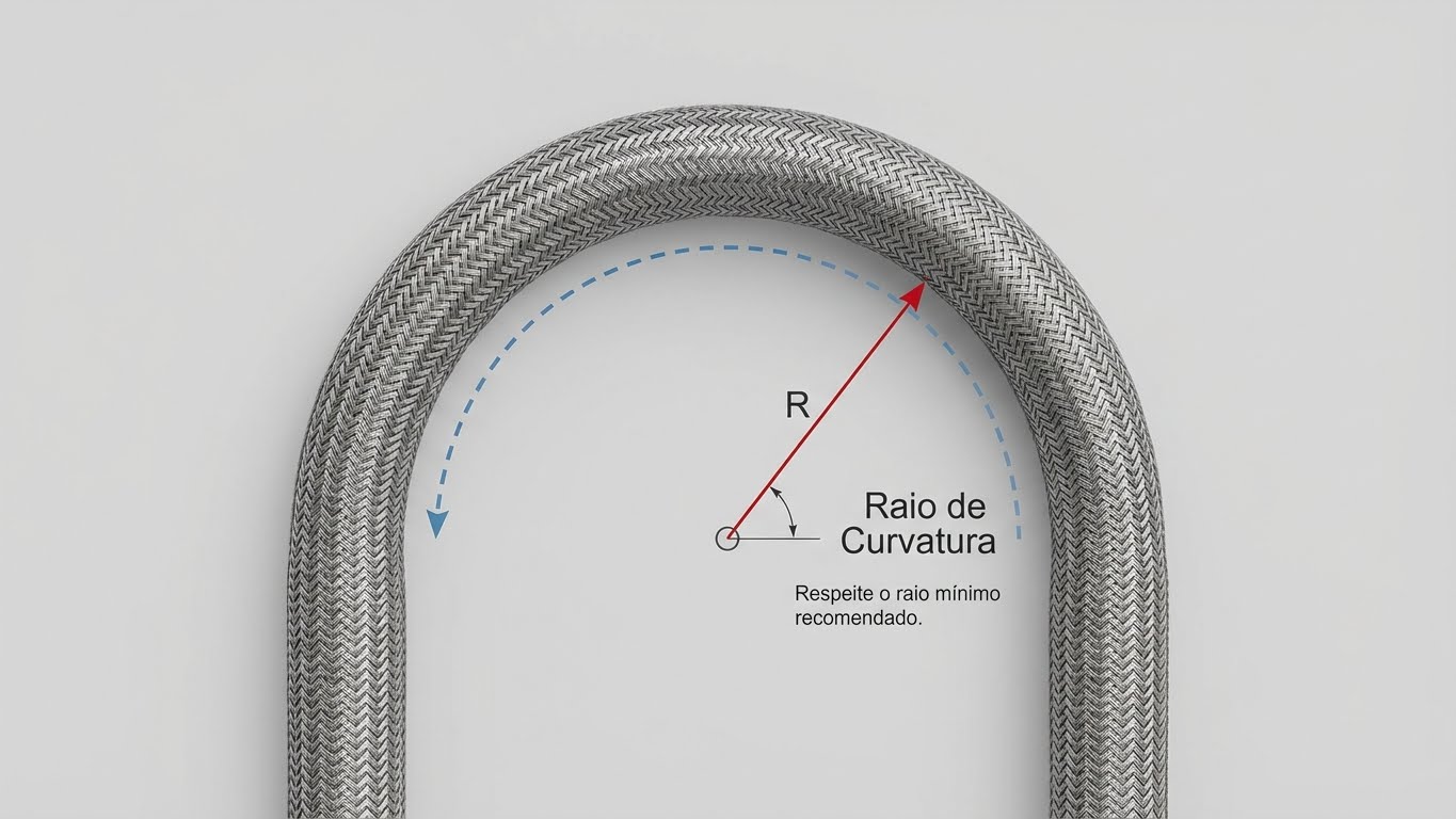 O raio mínimo de curvatura é informado pelo fabricante no catálogo técnico, geralmente como Rmin (mm) ou Minimum Bend Radius. O valor pode variar conforme diâmetro nominal, tipo de reforço, pressão e aplicação (estática ou dinâmica).